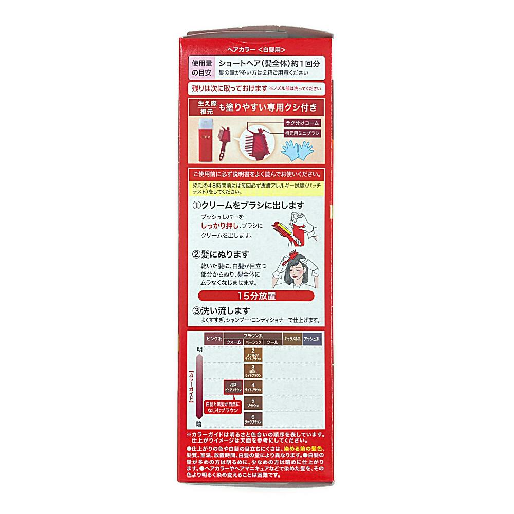 1.プッシュレバーをしっかり押し、ブラシにクリームを出します 2.乾いた髪に、白髪が目立つ部分からぬり、髪全体にムラなくなじませます (15分放置) 3.よくすすぎ、シャンプー・コンディショナーで仕上げます