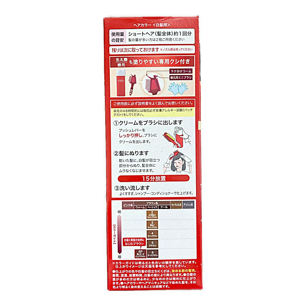 1.プッシュレバーをしっかり押し、ブラシにクリームを出します 2.乾いた髪に、白髪が目立つ部分から塗り、髪全体にムラなくなじませます(15分放置) 3.よくすすぎ、シャンプー・コンディショナーで仕上げます