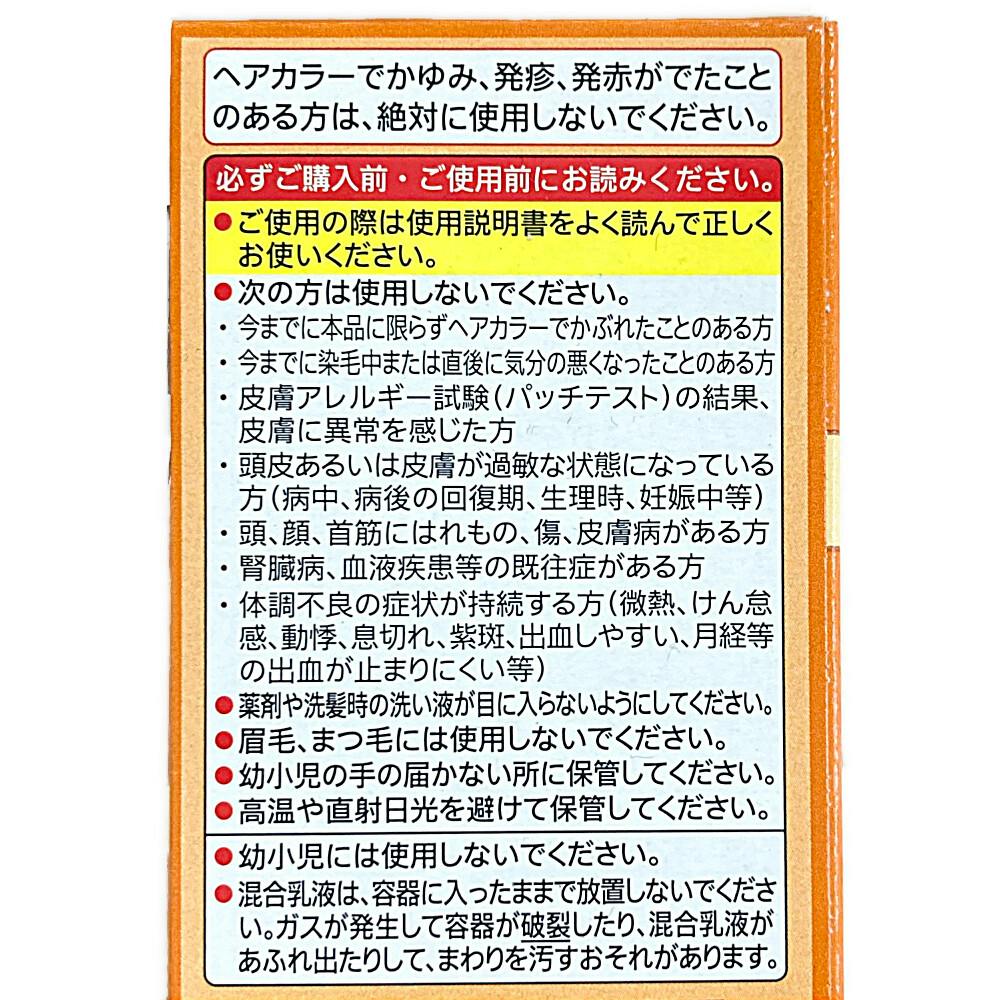 ●次の方は使用しないでください●今までに本品に限らずヘアカラーでかぶれたことのある方。●今までに染毛中または直後に気分の悪くなったことのある方。●皮膚アレルギーテスト(パッチテスト)の結果、皮膚に異常を感じた方。など