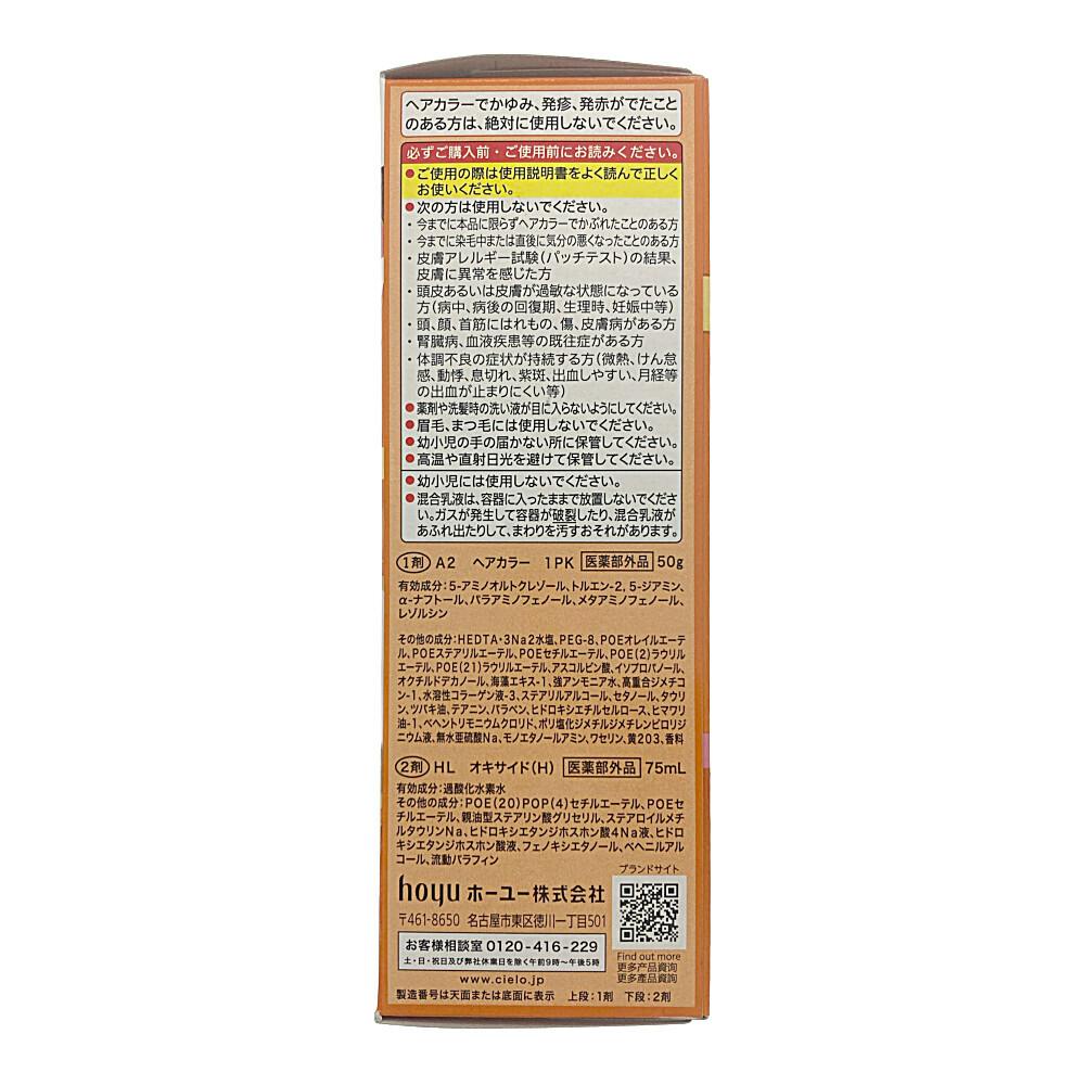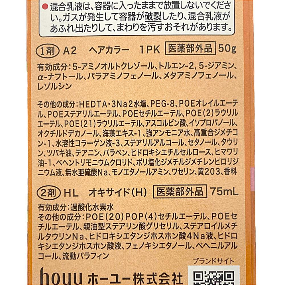 1剤/有効成分:5-アミノオルトクレゾール、その他の成分: HEDTA-3Na2水塩、PEG-8 2剤/有効成分: 過酸化水素水、その他の成分:POE(20)POP(4)セチルエーテル、POEセチルエーテル など