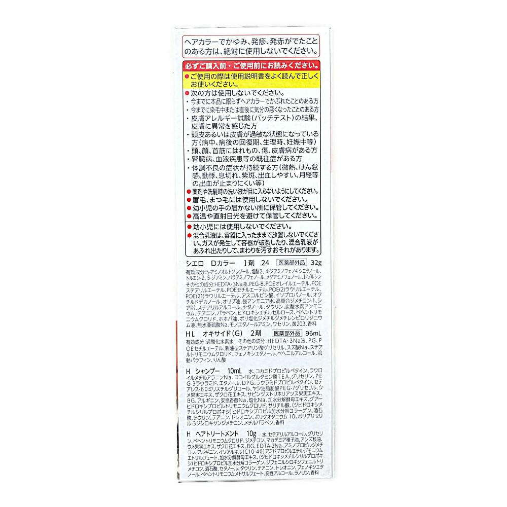 ●シエロDカラー 1剤 24:50g ●HLオキサイド(G):96mL ●Hシャンプー:10mL ●Hヘアトリートメント:10g