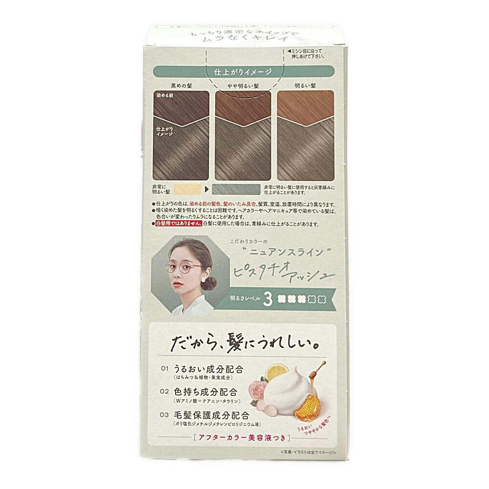 ●こだわりカラーのニュアンスライン ピスタチオアッシュ ●毛髪保護成分配合(ポリ塩化ジメチルジメチレンピロリジニウム液) ●うるおいつややかな髪色へ ●アフターカラー美容液つき