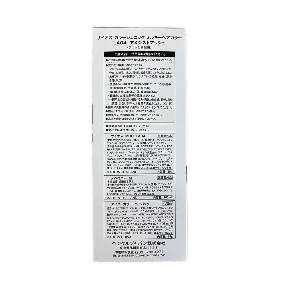 ●(1剤)サイオス MHC LA04:50g ●(2剤)デベロバー M:100mL ●アフターカラーヘアパック:15g