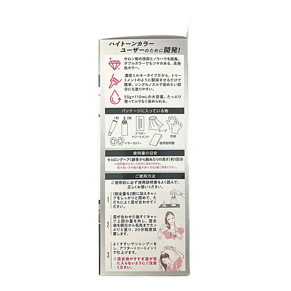 ●シルバー発色×極上ツヤ ●サロン発ボンディング・テクノロジー搭載 ●ヘアカラーでかぶれたことのある方は絶対に使用しないでください ●ヘアカラーはアレルギー反応をおこすことがあります ●皮膚アレルギー試験(パッチテスト)を毎回必ず行ってください