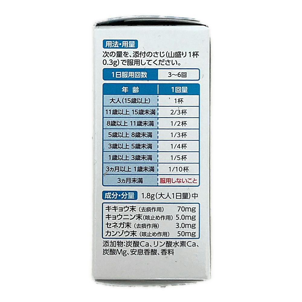 ●次の量を、添付のさじ(山盛り1杯0.3g)で服用してください。●1日服用回数:3~6回●年齡:1回量/大人(15歳以上):1杯、11歳以上15歳未満:2/3杯、8歳以上11歳未満:1/2杯、5歳以上8歳未満:1/3杯、3歳以上5歳未満:1/4杯、1歳以上3歳未満:1/5杯、3ヵ月以上1歳未満:1/10杯、等