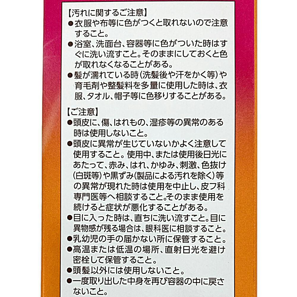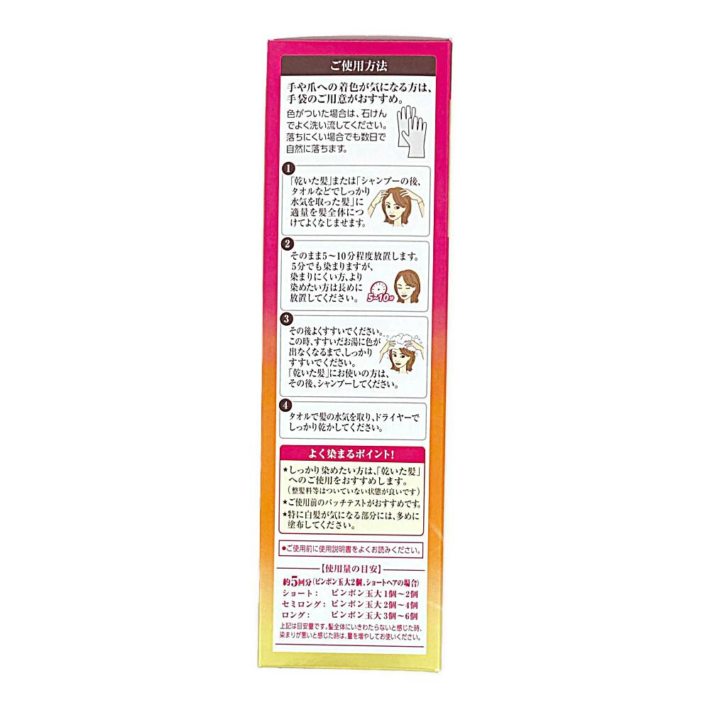 ●シャンプー前の乾いた状態で、適量を髪全体につけてよくなじませます。●そのまま5~10分程度放置します。5分でも染まりますが、より染めたい方は10分放置してください。●その後すすいでください。その後シャンプーしてください。