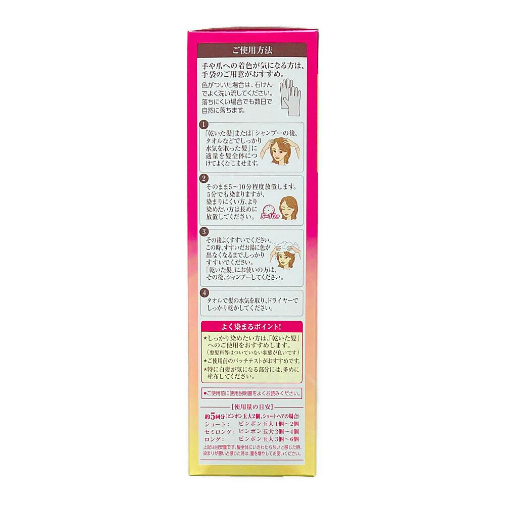 約5回分(ピンポン玉大2個、ショートヘアの場合)/ショート:ピンポン玉大1個~2個、セミロング:ピンポン玉大2個~4個、ロング:ピンポン玉大3個~6個※上記は目安量です。髪全体にいきわたらないと感じた時、染まりが悪いと感じた時は、量を増やしてお使いください
