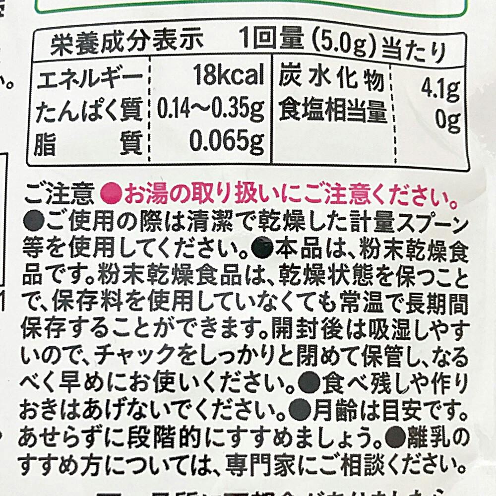 ●お湯の取り扱いにご注意ください。●ご使用の際は清潔で乾いた計量スプーンを使用してください。●本品は粉末乾燥食品です。粉末乾燥食品は乾燥状態を保つことで保存料を使用していなくても常温で長期間保存することができます。など