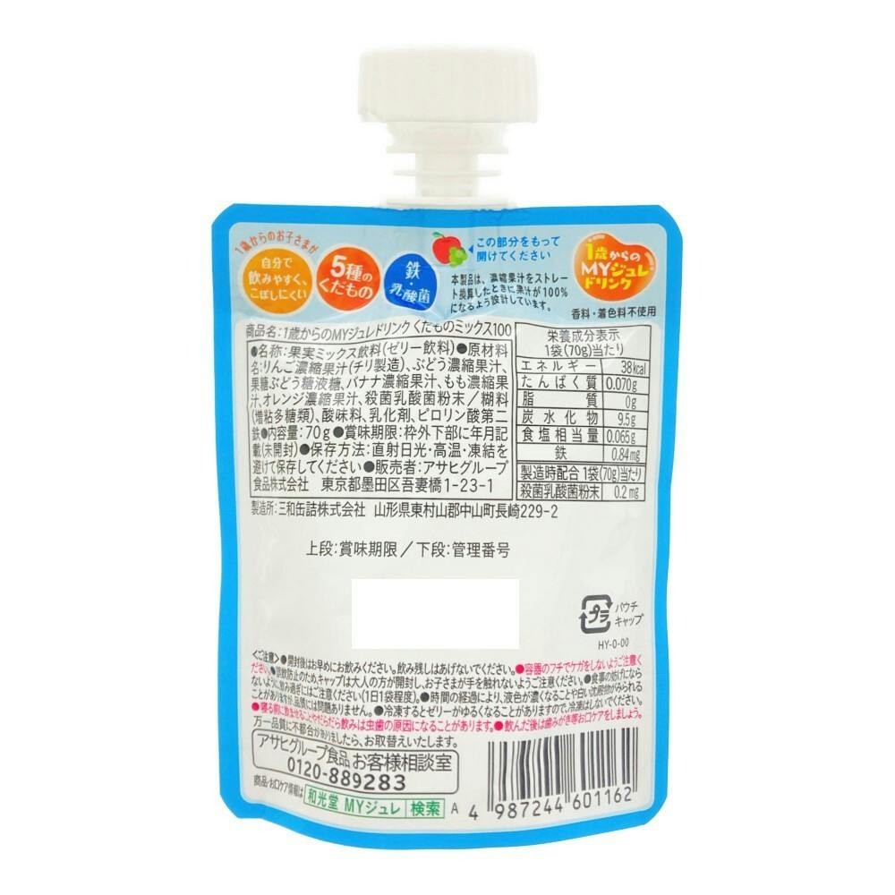 ●1歳からのお子さまが自分で飲みやすく、こぼしにくい ●5種のくだもの ●鉄・乳酸菌 ●1歳からのMYジュレドリンク ●香料・着色料不使用 ●製造時配合 1袋(70g)当たり/殺菌乳酸菌粉末:0.2mg