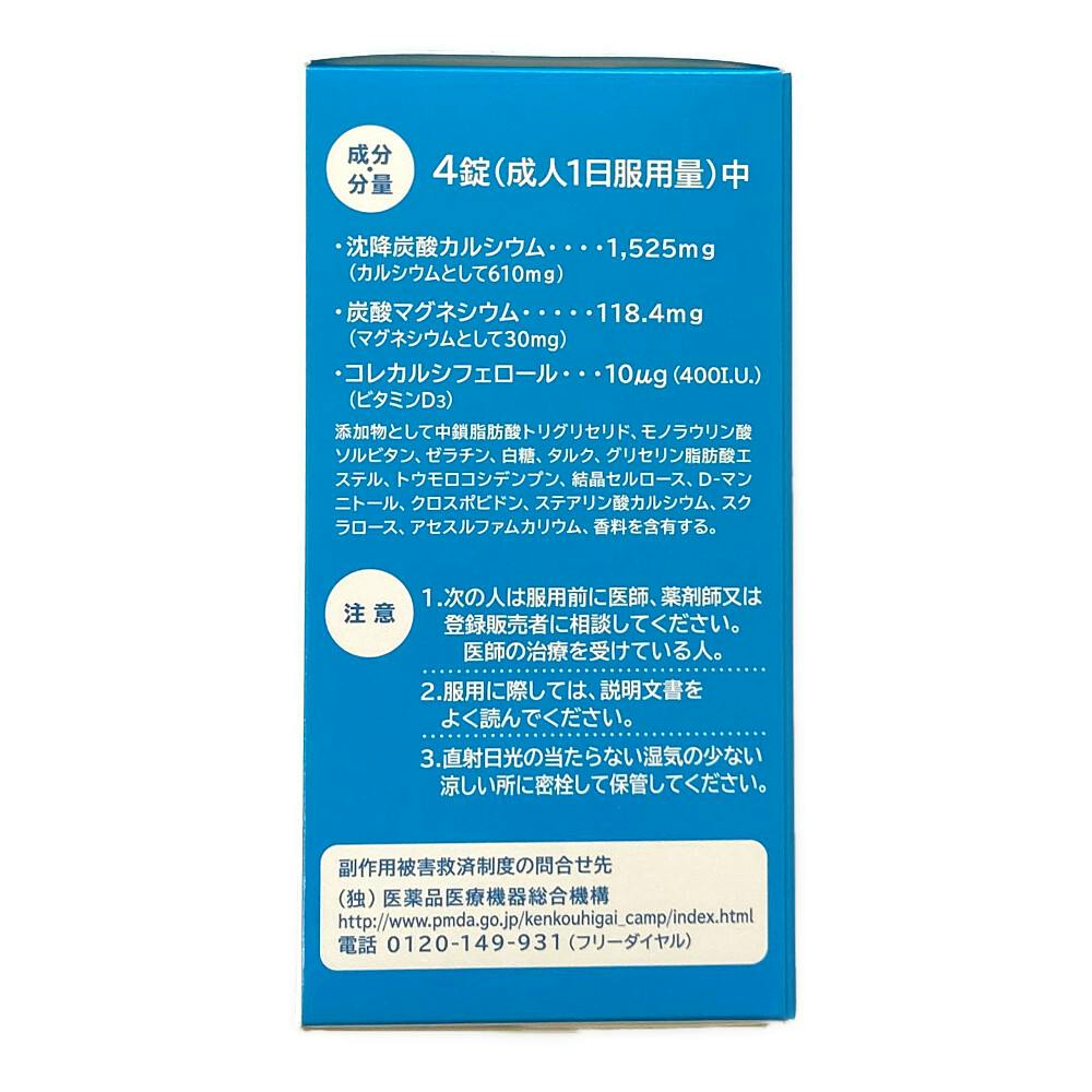 成分・分量/4錠(成人1日服用量)中/沈降炭酸カルシウム:1525mg(カルシウムとして610mg)、炭酸マグネシウム:118.4mg(マグネシウムとして30mg)、コレカルシフェロール(ビタミンD3):10μg(400I.U.)