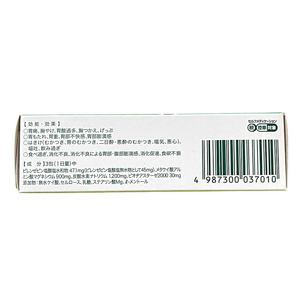 ピレンゼピン塩酸塩水和物:47.1mg(ピレンゼピン塩酸塩無水物として45mg)、メタケイ酸アルミン酸マグネシウム:900mg、炭酸水素ナトリウム:1200mg、ビオヂアスターゼ2000:30mg