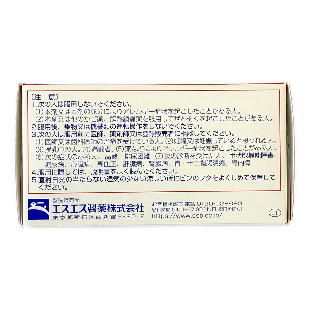 アセトアミノフェン900mg、クロルフェニラミンマレイン酸塩7.5mg、デキストロメトルファン臭化水素酸塩水和物48mg、dl-メチルエフェドリン塩酸塩60mg、ヘスペリジン45mg、カンゾウエキス(カンゾウ750mgに相当)187.5mg、ショウキョウ末150mg、無水カフェイン75mg