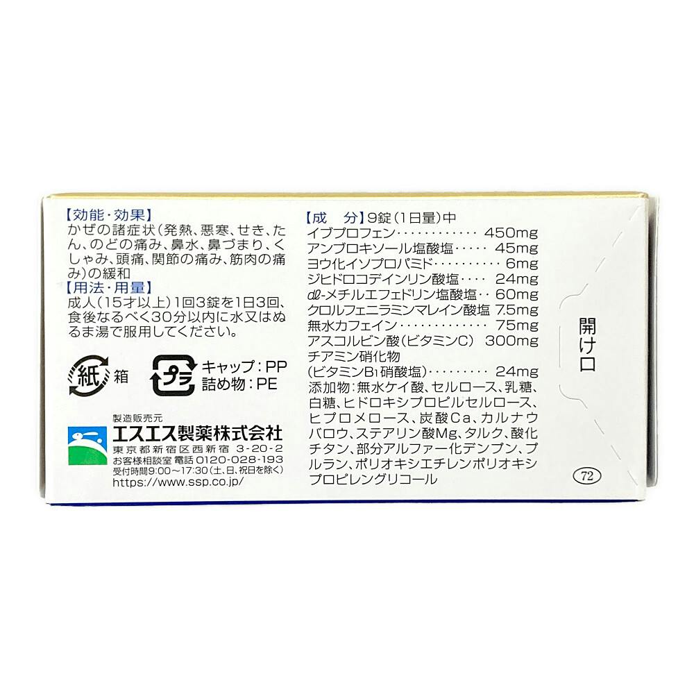 9錠(1日量)中/イブプロフェン:450mg、アンブロキソール塩酸塩:45mg、ヨウ化イソプロパミド:6mg、ジヒドロコデインリン酸塩:24mg、dl-メチルエフェドリン塩酸塩:60mg、クロルフェニラミンマレイン酸塩:7.5mg、無水カフェイン:75mg、アスコルビン酸(ビタミンC):300mg、など