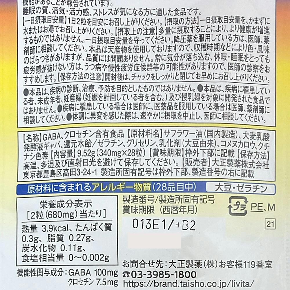 サフラワー油(国内製造)、大麦乳酸発酵液ギャバ、還元水飴、黒ゴマ抽出物/ゼラチン、グリセリン、乳化剤(大豆由来)、コメヌカロウ、クチナシ色素