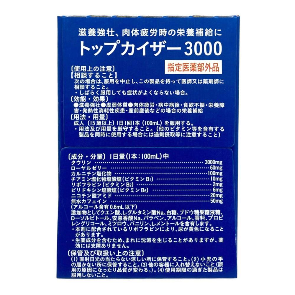 1日量(1本:100mL)中/タウリン:3000mg、ローヤルゼリー:60mg、カルニチン塩化物:100mg、チアミン塩化物塩酸塩(ビタミンB1):10mg、リボフラビン(ビタミンB2):2mg、ピリドキシン塩酸塩(ビタミンB6):6mg、ニコチン酸アミド:20mg、無水カフェイン:50mg