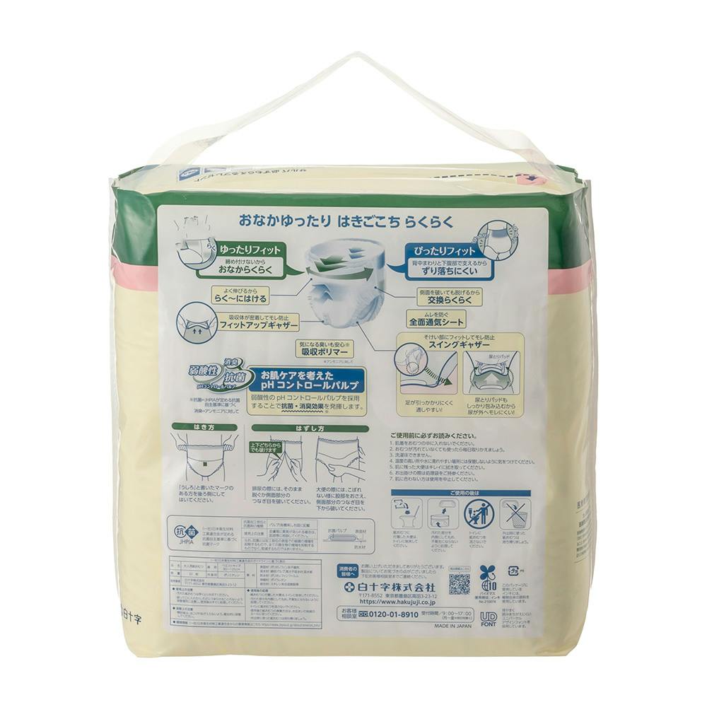 ●長めの「フィットアップギャザー」がお腹からお尻まで押し上げてぴったりフィットします。 ●尿とりパッドを包み込んで外へのモレを防ぐスイングギャザーを採用しています。大型パッドとの組み合わせでもご使用できます。 他