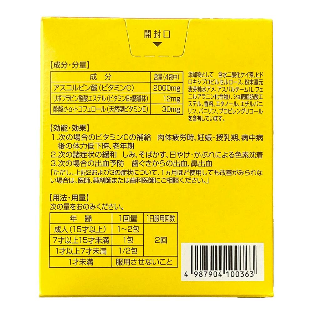 4包中/アスコルビン酸(ビタミンC):2000mg、リボフラビン酪酸エステル(ビタミンB2誘導体):12mg、酢酸d-α-トコフェロール(天然型ビタミンE):30mg