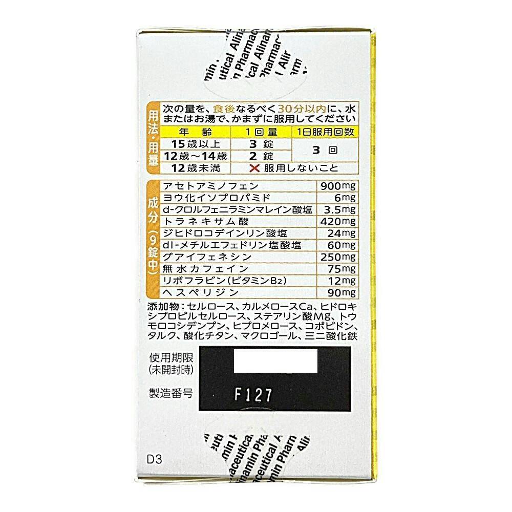 9錠中/アセトアミノフェン:900mg、ヨウ化イソプロパミド:6mg、d-クロルフェニラミンマレイン酸塩:3.5mg、トラネキサム酸:420mg、ジヒドロコデインリン酸塩:24mg、dl-メチルエフェドリン塩酸塩:60mg、グアイフェネシン:250mg、無水カフェイン:75mg、など