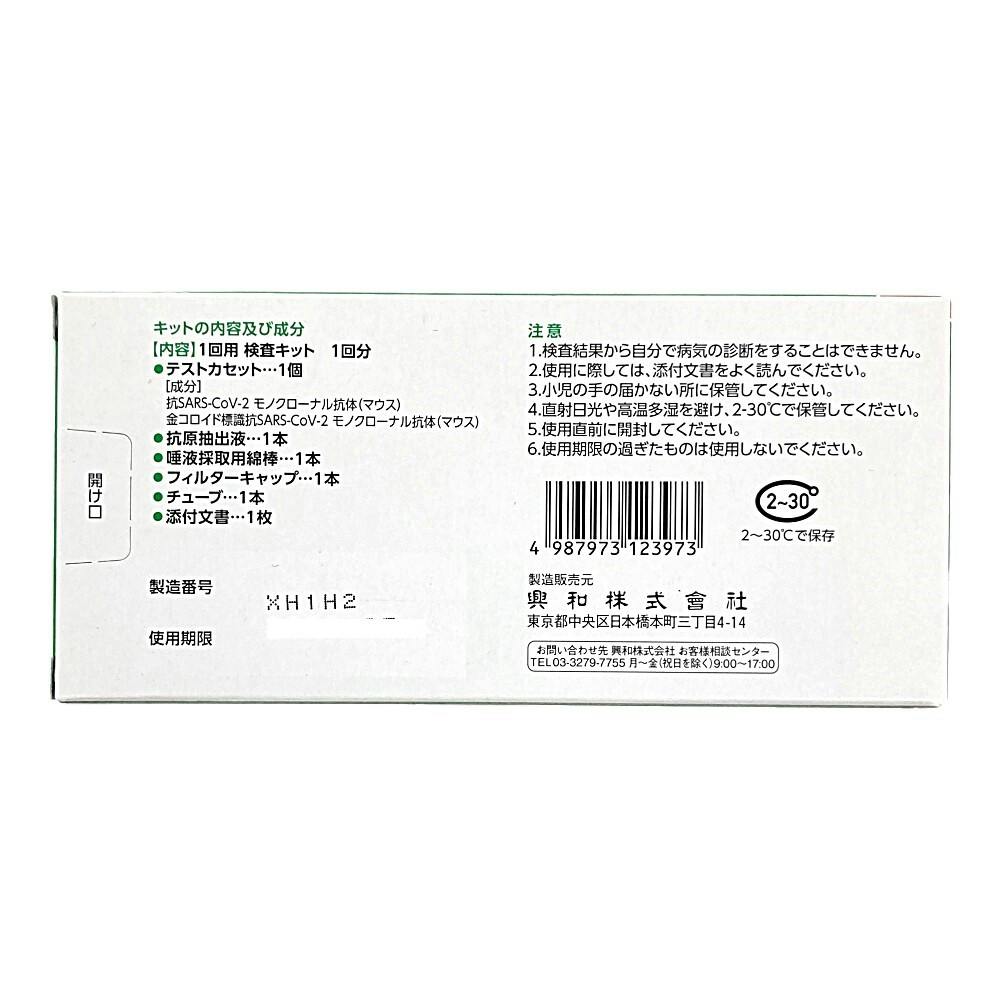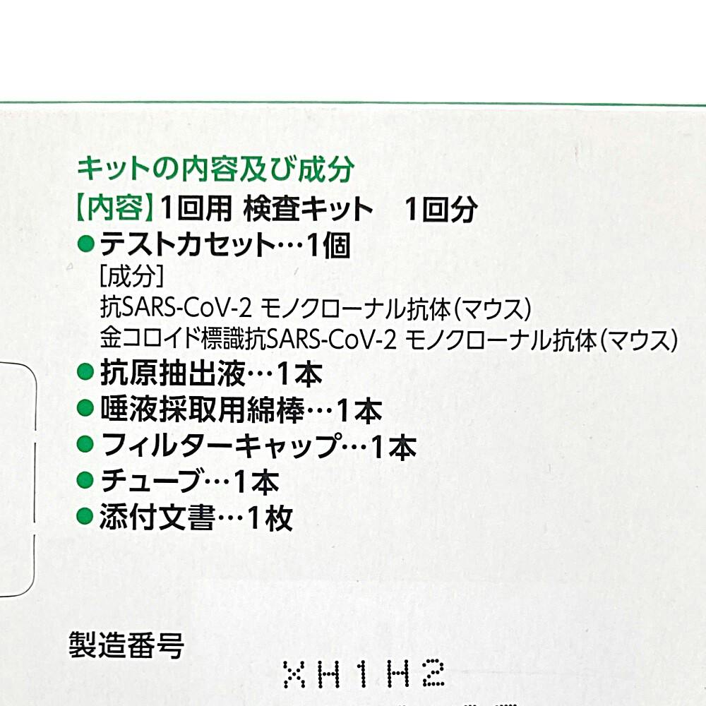 (内容)1回用検査キット:1回分/テストカセット:1個、抗原抽出液:1本、唾液採取用綿棒:1本、フィルターキャップ:1本、チューブ:1本、添付文書:1枚