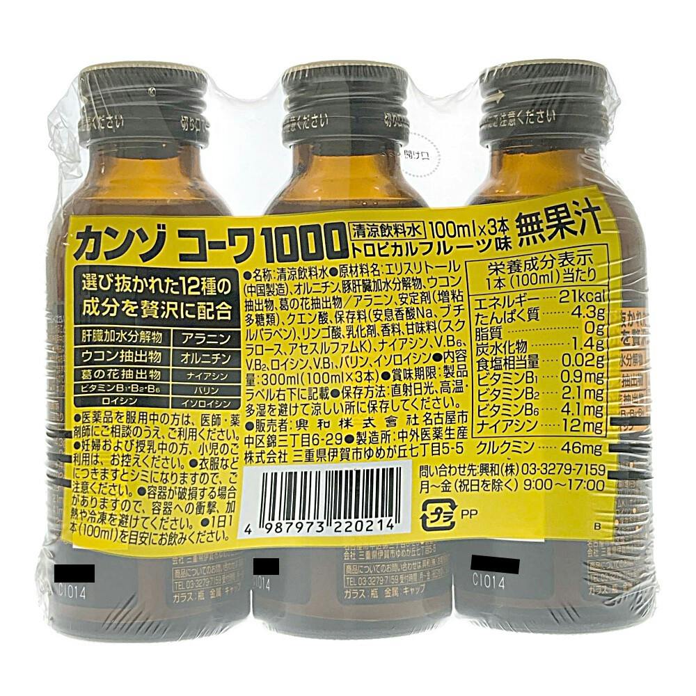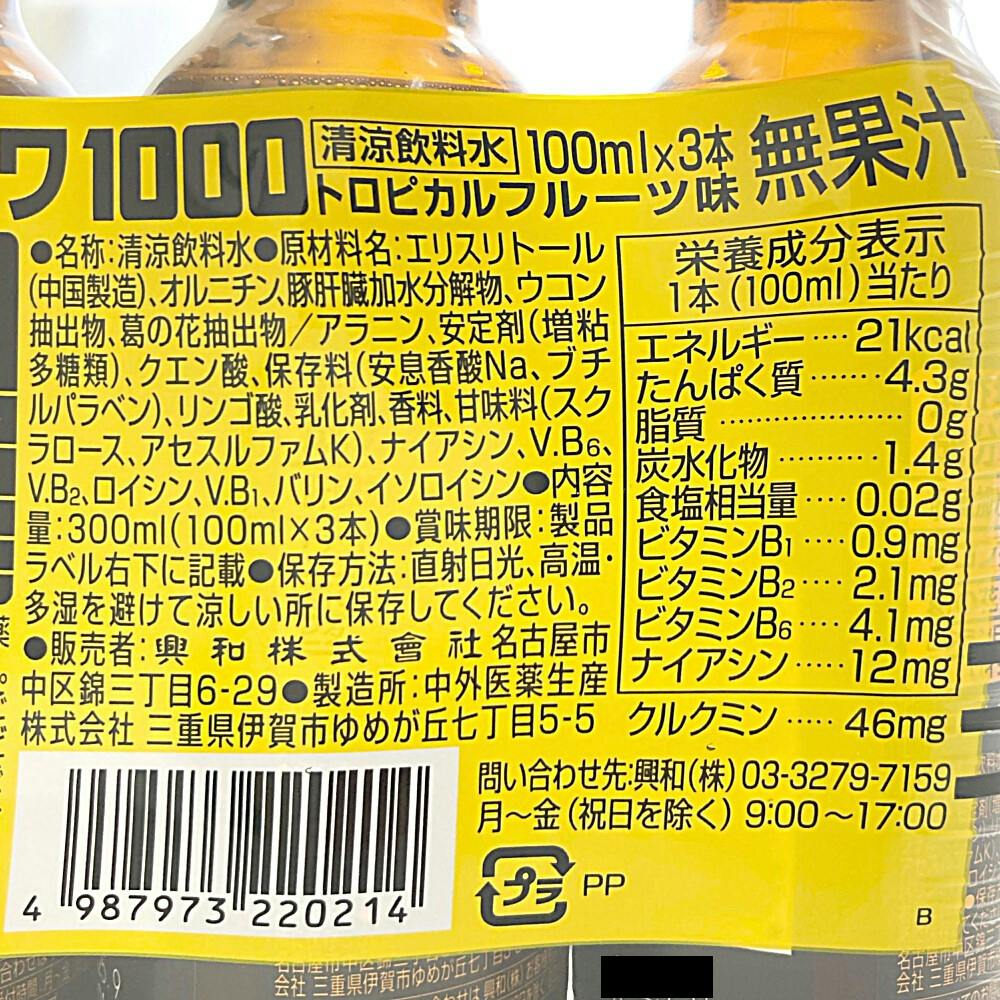 1本(100mL)当たり/エネルギー:21kcal、たんぱく質:4.3g、脂質:0g、炭水化物:1.4g、食塩相当量:0.02g、ビタミンB1:0.9mg、ビタミンB2:2.1mg、ビタミンB6:4.1mg、ナイアシン:12mg クルクミン:46mg