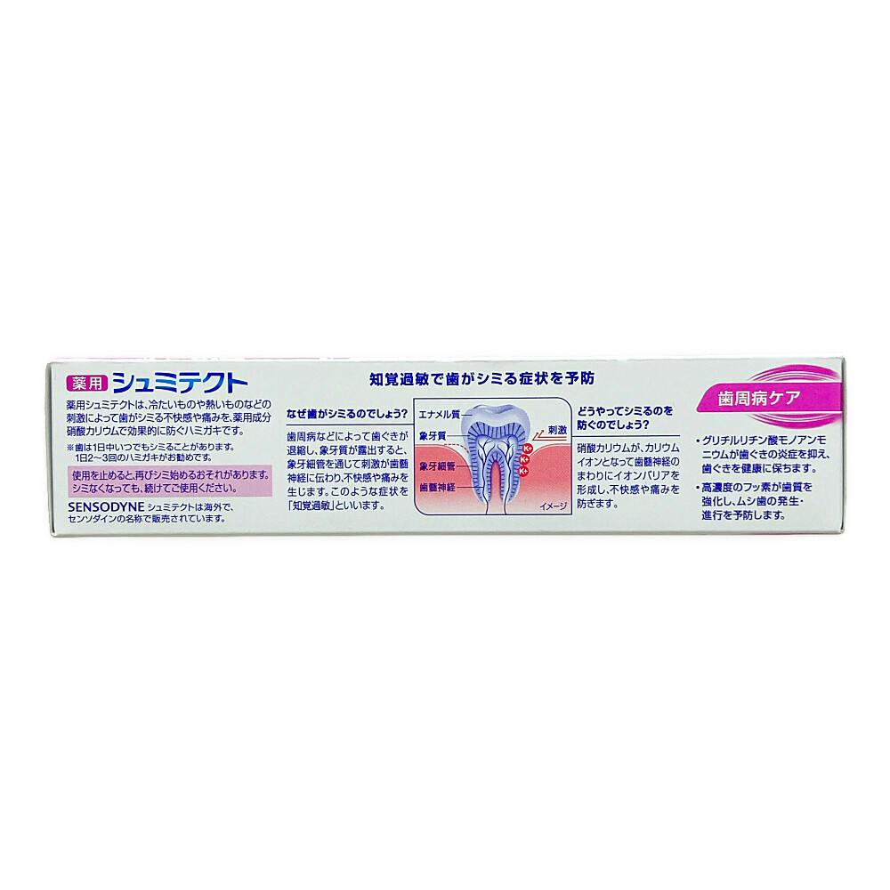 ●薬用シュミテクトは、冷たいものや熱いものなどの刺激によって歯がシミる不快感や痛みを、薬用成分硝酸カリウムで効果的に防ぐハミガキです ●使用を止めると、再びシミ始めるおそれがあります。シミなくなっても、続けてご使用ください。