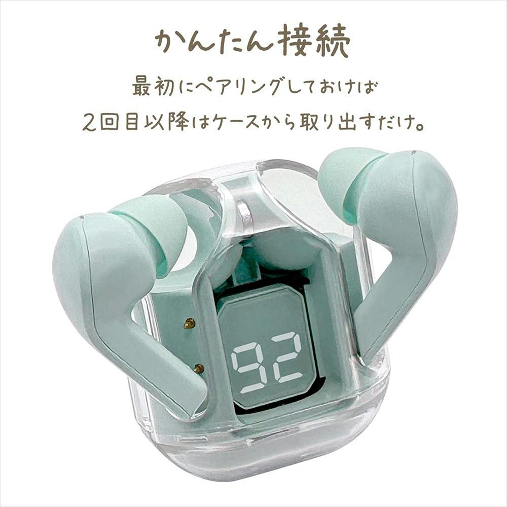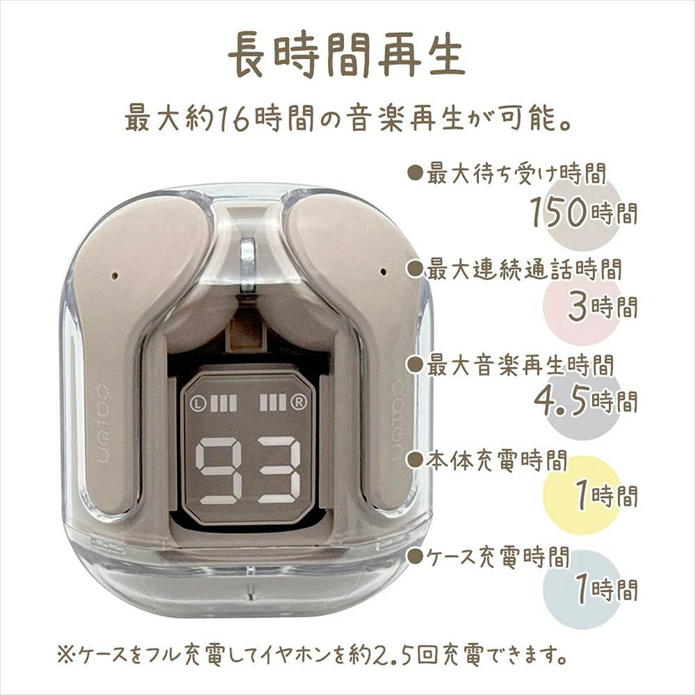 "イヤホン本体に通話用マイクを搭載、ハンズフリー通話に対応。充電ケースの外側に、電池状態が確認できる便利な液晶ディスプレイ搭載。 "