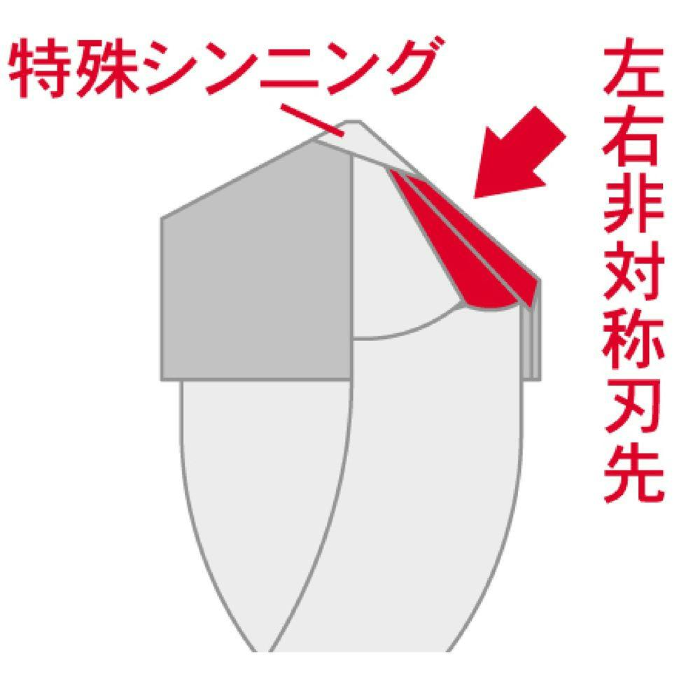 ●シャンクから刃先まで一体形状の為、刃先のぶれやびびりが無く、適確な穿孔が可能。 ●左右非対称刃先に加え、特殊シンニング研磨により、滑りやすい鉄板を含む幅広い被削材にもマルチに対応。