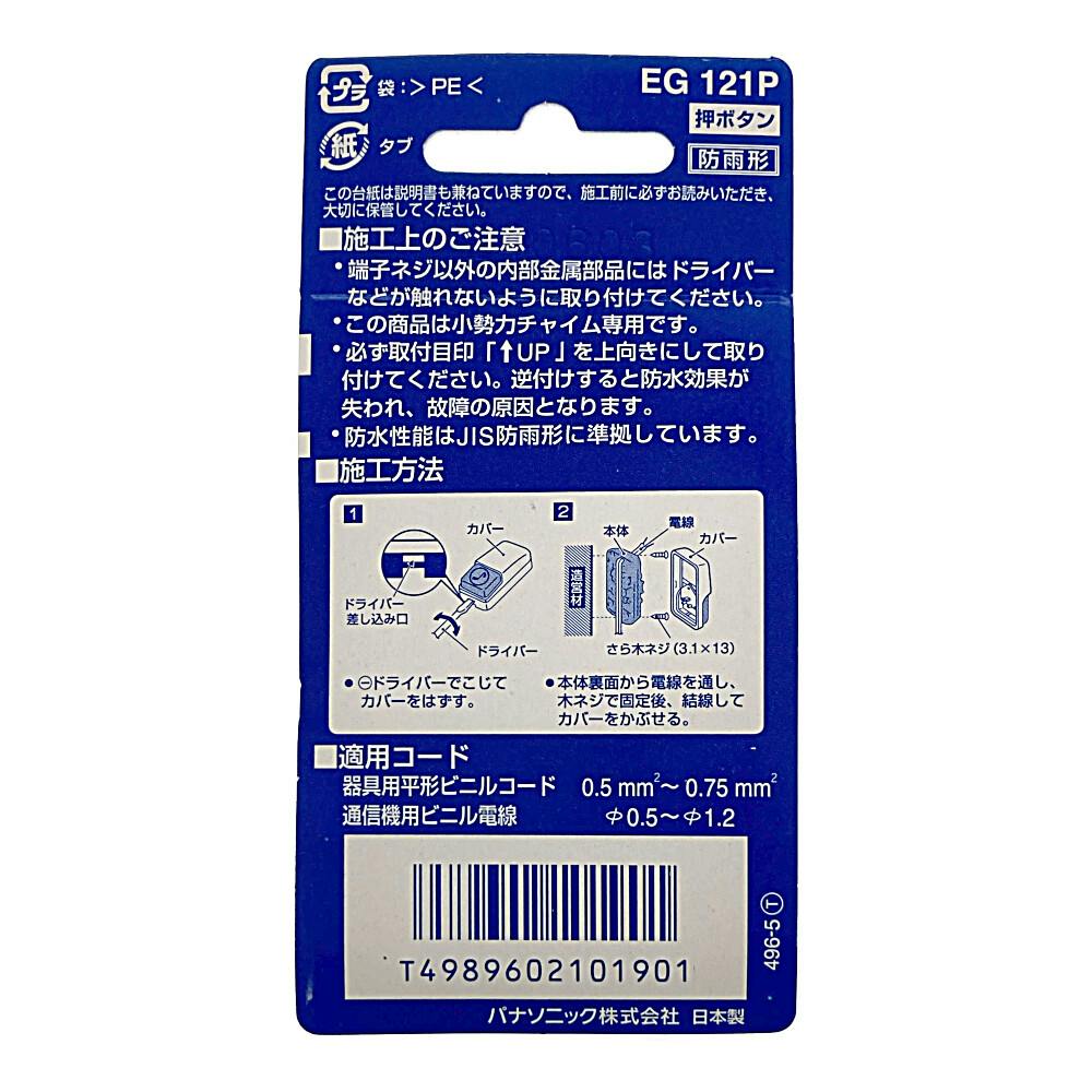 施工上のご注意/●端子ネジ以外の内部金属部品にはドライバーなどが触れないように取り付けてください。●この商品は小勢力チャイム専用です。●必ず取付目印「↑UP」を上向きにして取り付けてください。逆付けすると防水効果が失われ、故障の原因となります。など