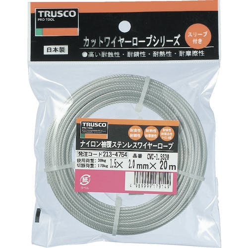 • 【CAINZ-DASH】トラスコ中山 ステンレスワイヤロープ ナイロン被覆 Φ1.5(2.0)X20m CWC-15S20【別送品】