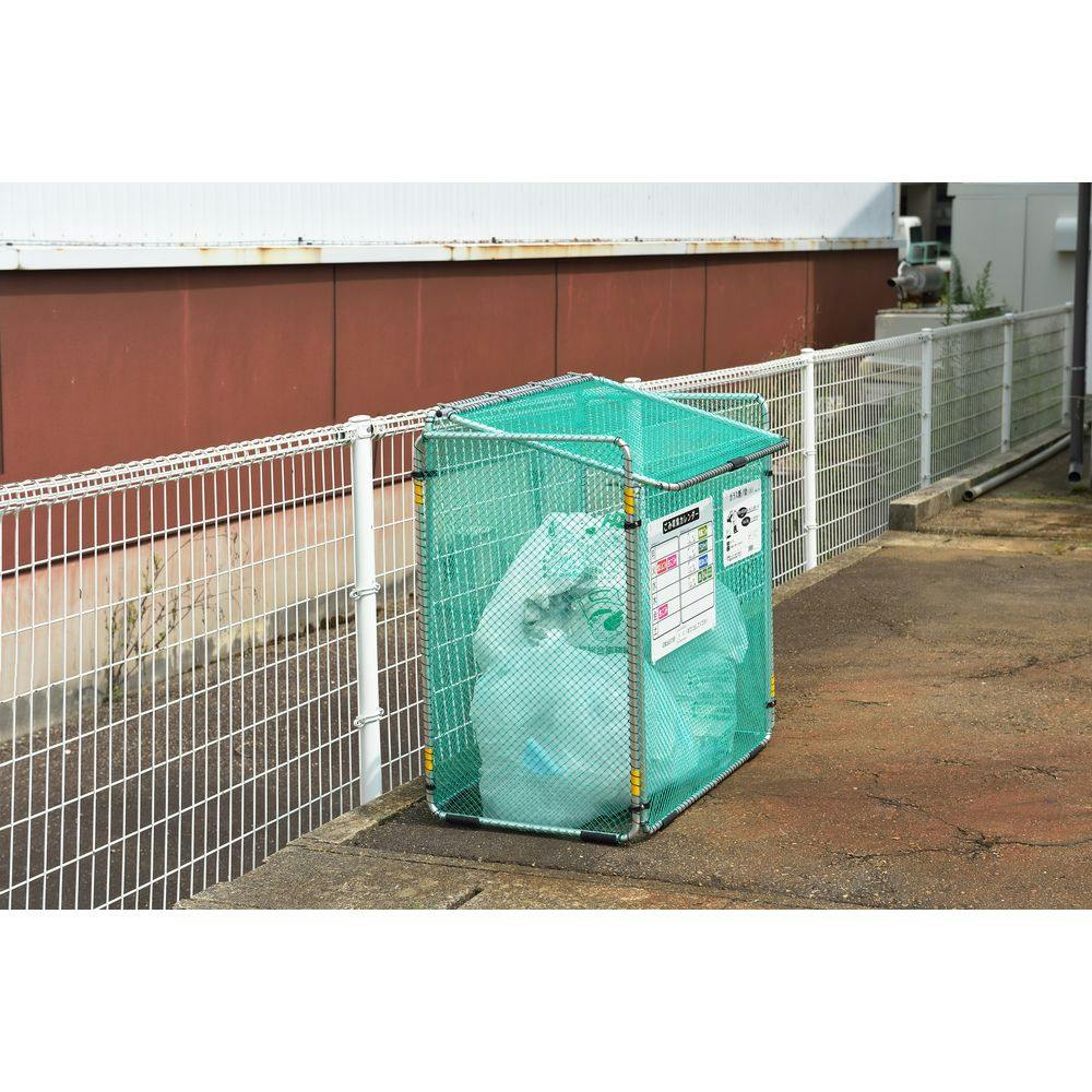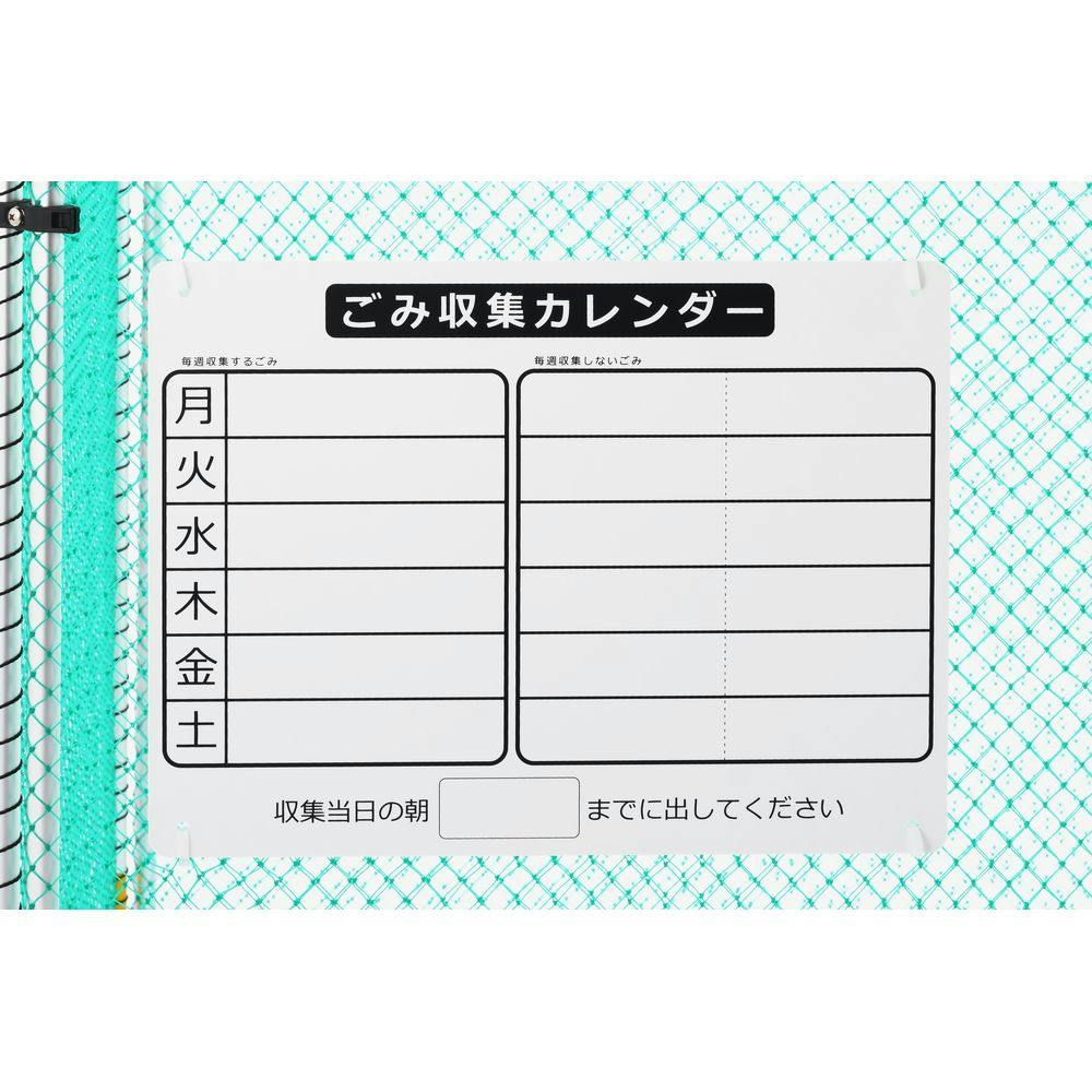 網は、2重張りで、しっかりとカラスなどから、ゴミを守ります。 反射テープは8ヶ所についております。 上蓋を上げたときに止まるので、安心・安全です。 カレンダープレート・案内板付きです。