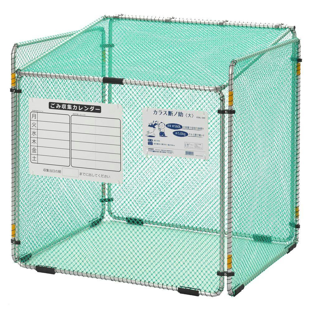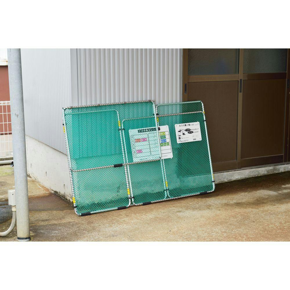 網は、2重張りで、しっかりとカラスなどから、ゴミを守ります。 反射テープは8ヶ所についております。 上蓋を上げたときに止まるので、安心・安全です。 カレンダープレート・案内板付きです。