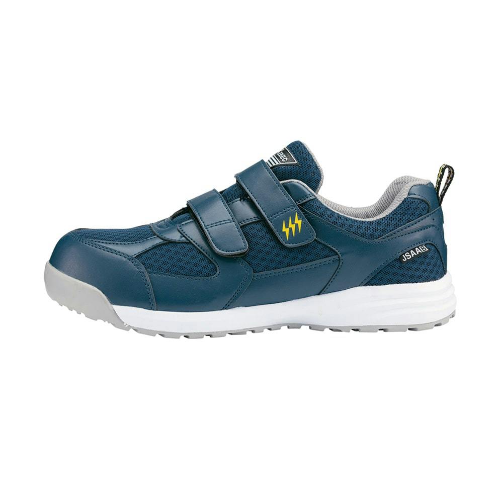 アッパーに通気性のいいメッシュを使用した静電気帯電防止セーフティシューズです。靴底の導電配合ラバーから人体や衣服に帯電した静電気を床面へと逃がします。