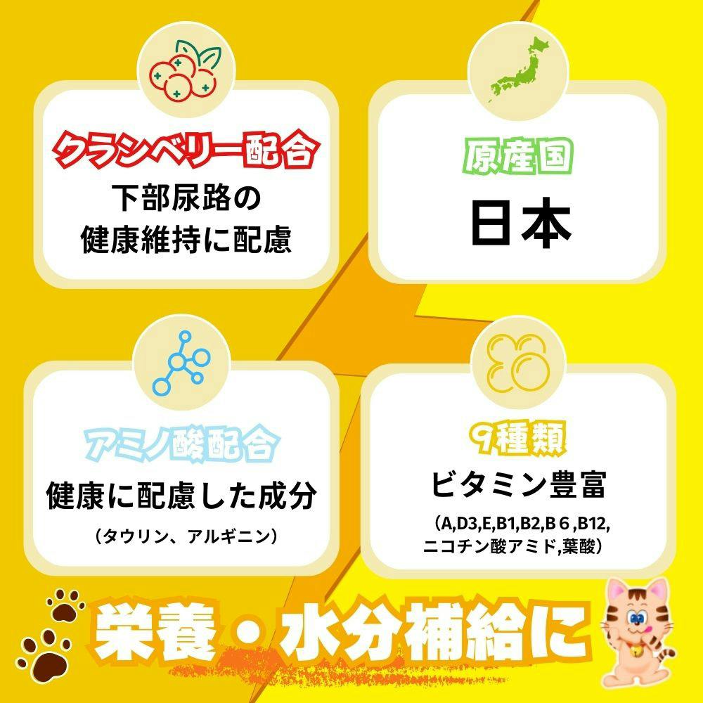 猫の必須アミノ酸であるタウリン・アルギニンと9種のビタミンを配合し栄養補給・水分補給に最適です。