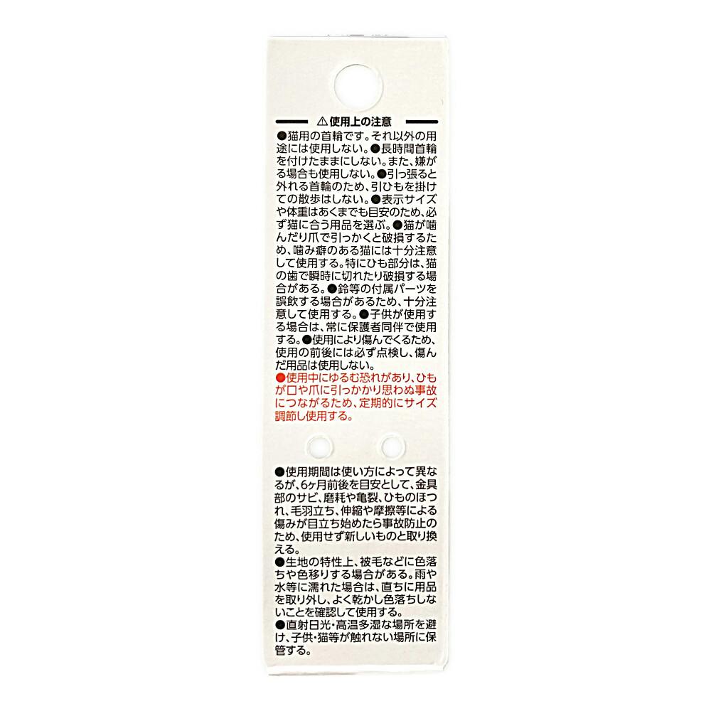 ●猫用の首輪です。それ以外の用途には使用しない。●長時間首輪を付けたままにしない。また嫌がる場合も使用しない。●引っ張ると外れる首輪のため、引ひもを掛けての散歩はしない。●表示サイズや体重はあくまでも目安のため、 必ず猫に合う用品を選ぶ。 など