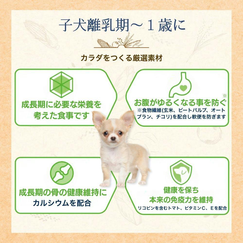 ●成長期に必要な栄養を考えた食事です●食物繊維配合でお腹がゆるくなることを防ぐ(※1)●健康な歯と骨を維持するカルシウムを配合●健康を保ち本来の免疫力を維持します(※2)●子犬にも食べやすいドーナツ型粒