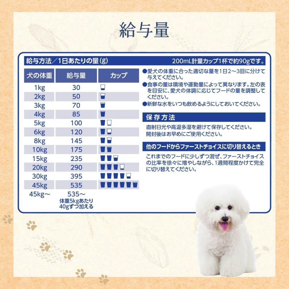 愛犬の体重に合った適切な量を1日2~3回に分けて与えてください。食事の量は環境や運動量によって異なります。愛犬の体調に応じてフードの量を調整してください。新鮮な水をいつも飲めるようにしておいてください。