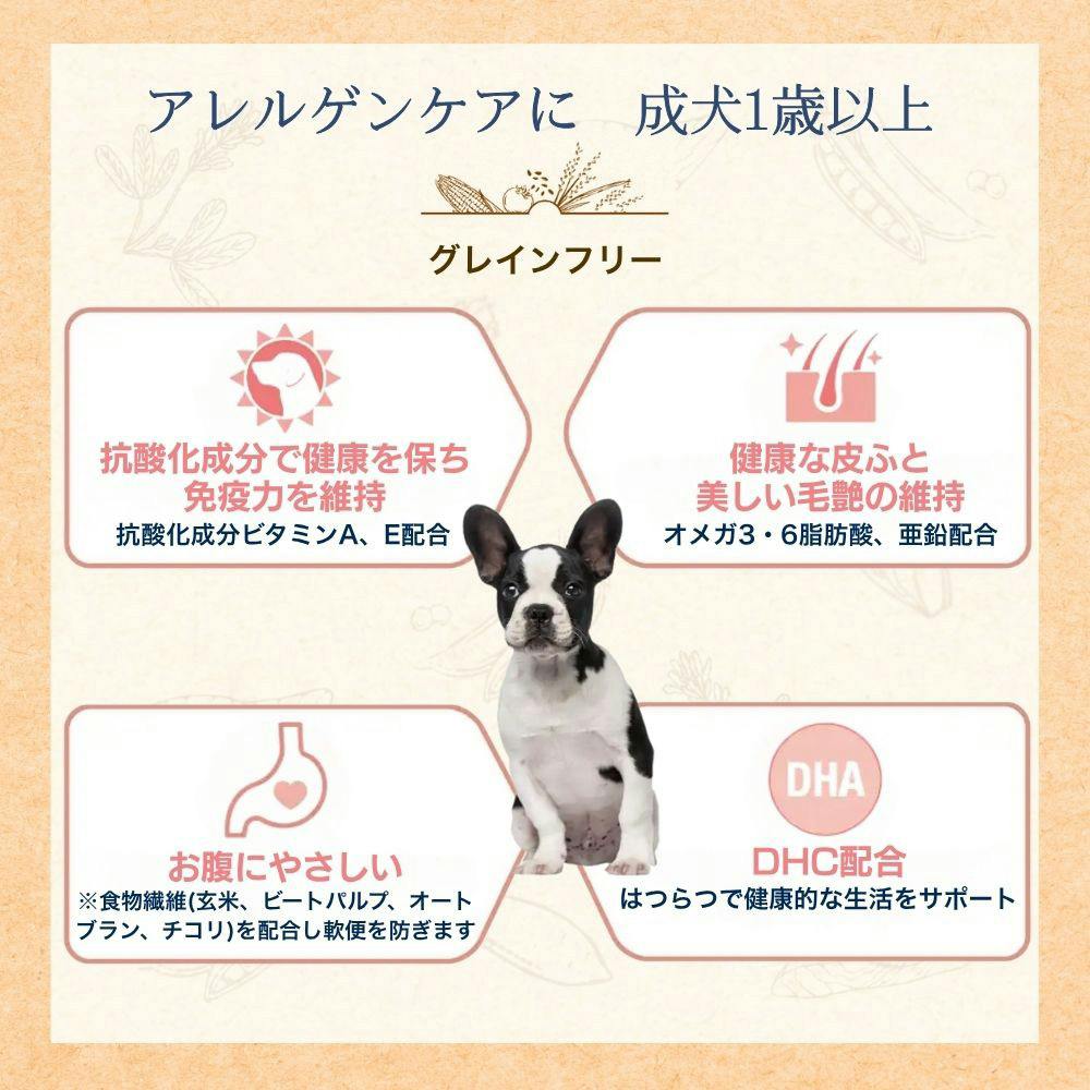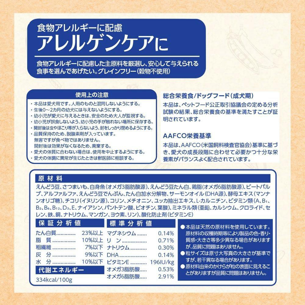 ●食物アレルギーの原因になりにくいタンパク源(白身魚、さつまいも、えんどう豆)を使用●健康を保ち本来の免疫力を維持します●健康な皮ふと美しい毛艶の維持●食物繊維配合でお腹が緩くなることを防ぐ●DHA配合ではつらつで健康的な生活をサポート