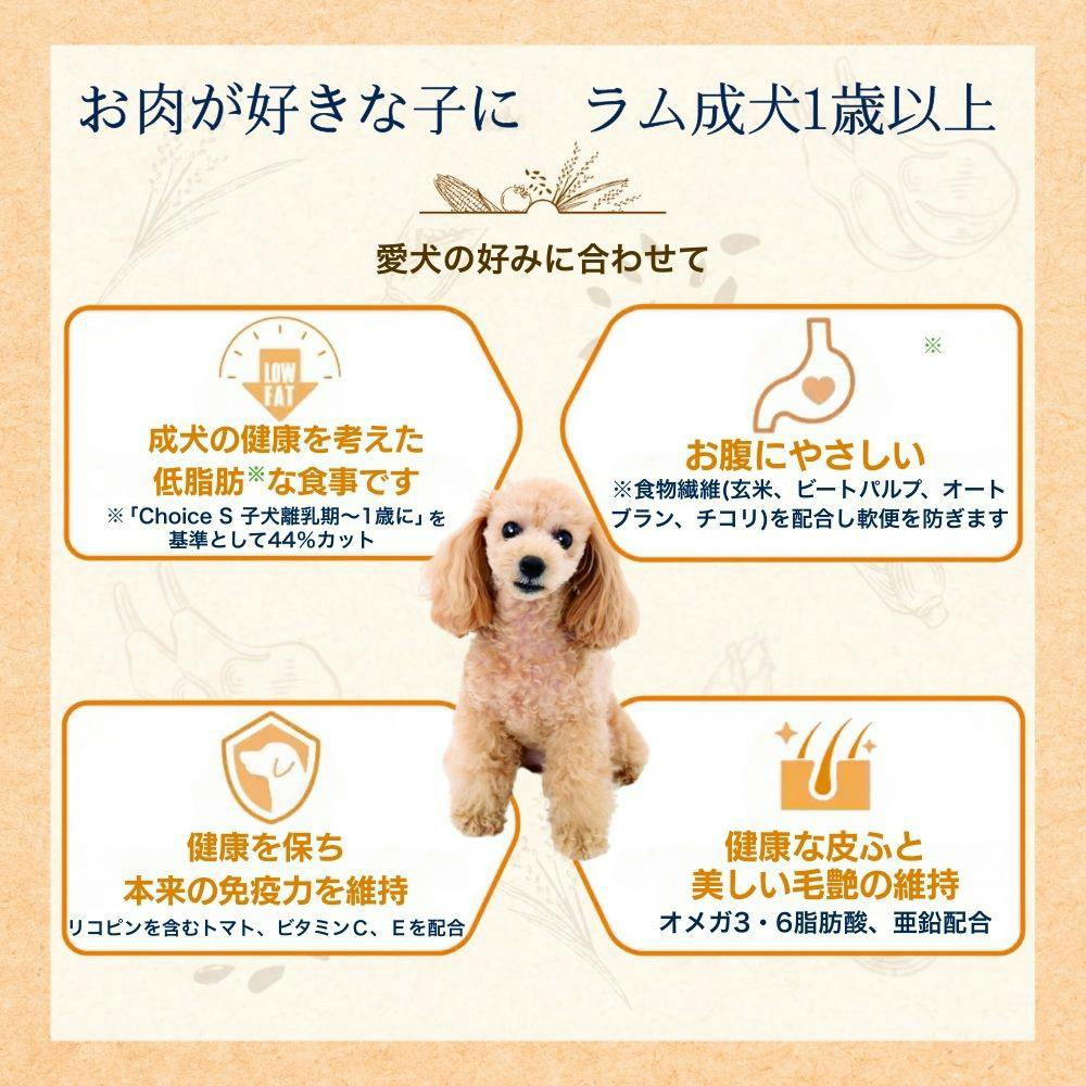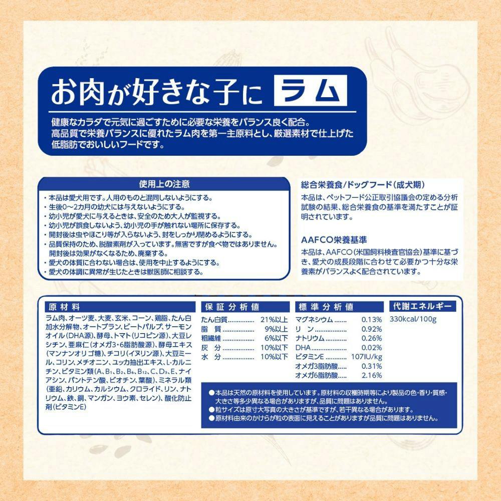 ●第一主原料に高品質なラム肉を使用●成犬の健康を考えた低脂肪な食事です●食物繊維配合でお腹が緩くなることを防ぐ●健康を保ち本来の免疫力を維持します●健康な皮ふと美しい毛艶の維持