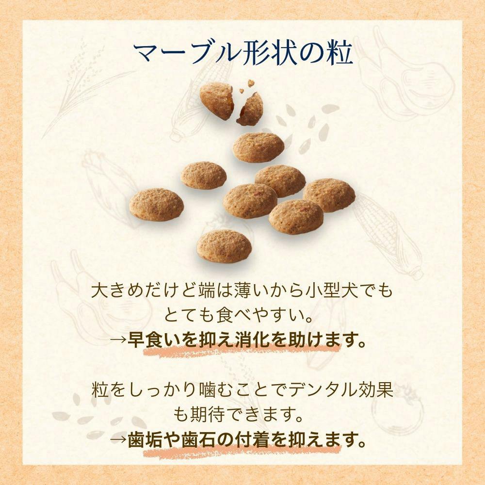 ラム肉、オーツ麦、大麦、玄米、コーン、鶏脂、たん白加水分解物、オートブラン、ビートパルプ、サーモンオイル(DHA源)、酵母、トマト(リコピン源)、大豆レシチン、亜麻仁(オメガ3・6脂肪酸源)、酵母エキス(マンナンオリゴ糖)、チコリ(イヌリン源)、大豆ミール、コリ