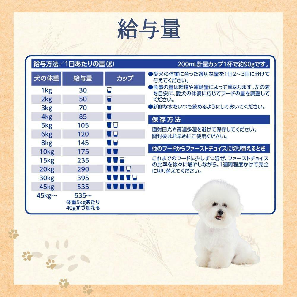 愛犬の体重に合った適切な量を1日2~3回に分けて与えてください。食事の量は環境や運動量によって異なります。愛犬の体調に応じてフードの量を調整してください。新鮮な水をいつも飲めるようにしておいてください。
