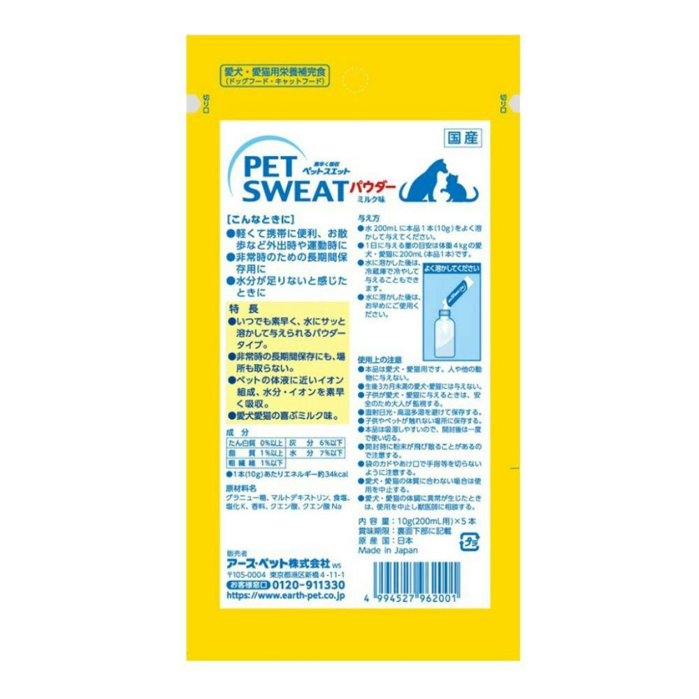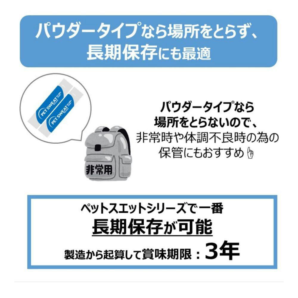 "愛犬・愛猫の飲料・水分補給に。 素早く吸収 PETSWEAT(ペットスエット)パウダー ●いつでも素早く、水にサッと溶かして与えられるパウダータイプ。 ●非常時の長期間保存にも、場所も取らない。 ●ペットの体液に近いイオン組成、水分・イオンを素早く吸収。