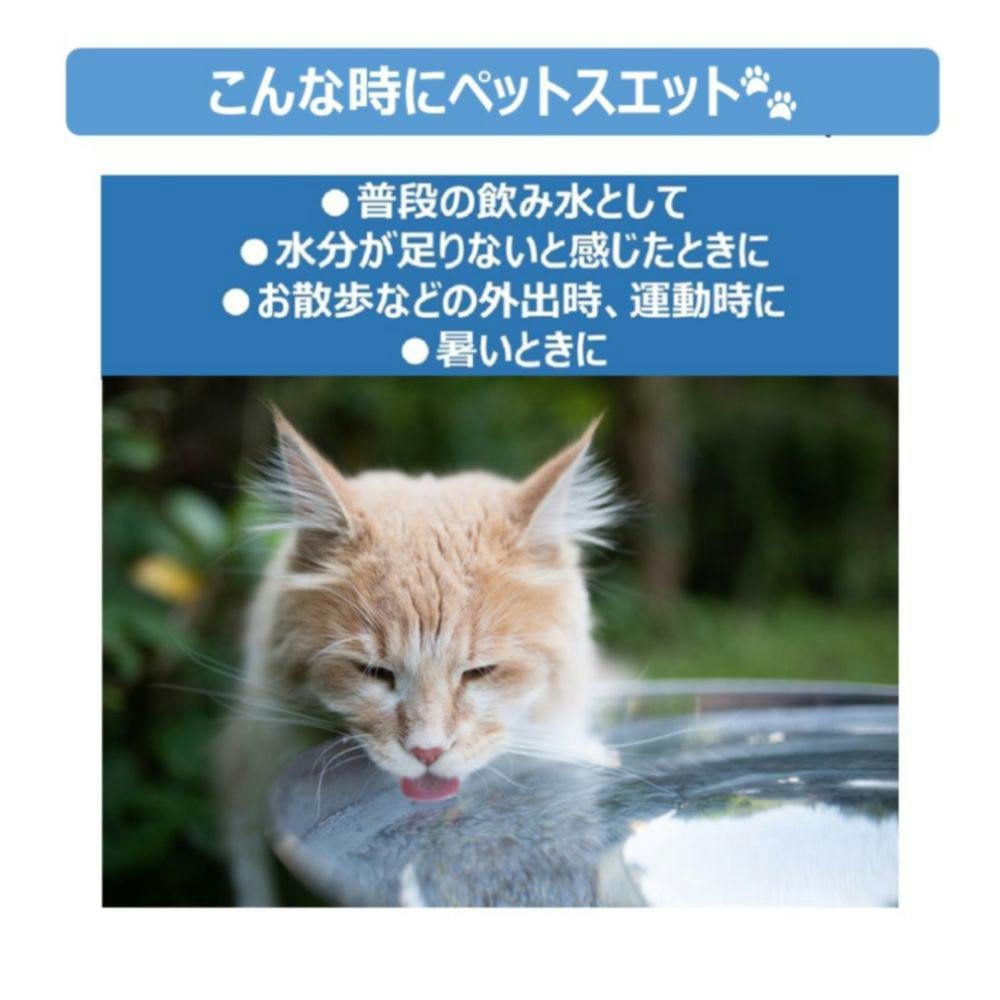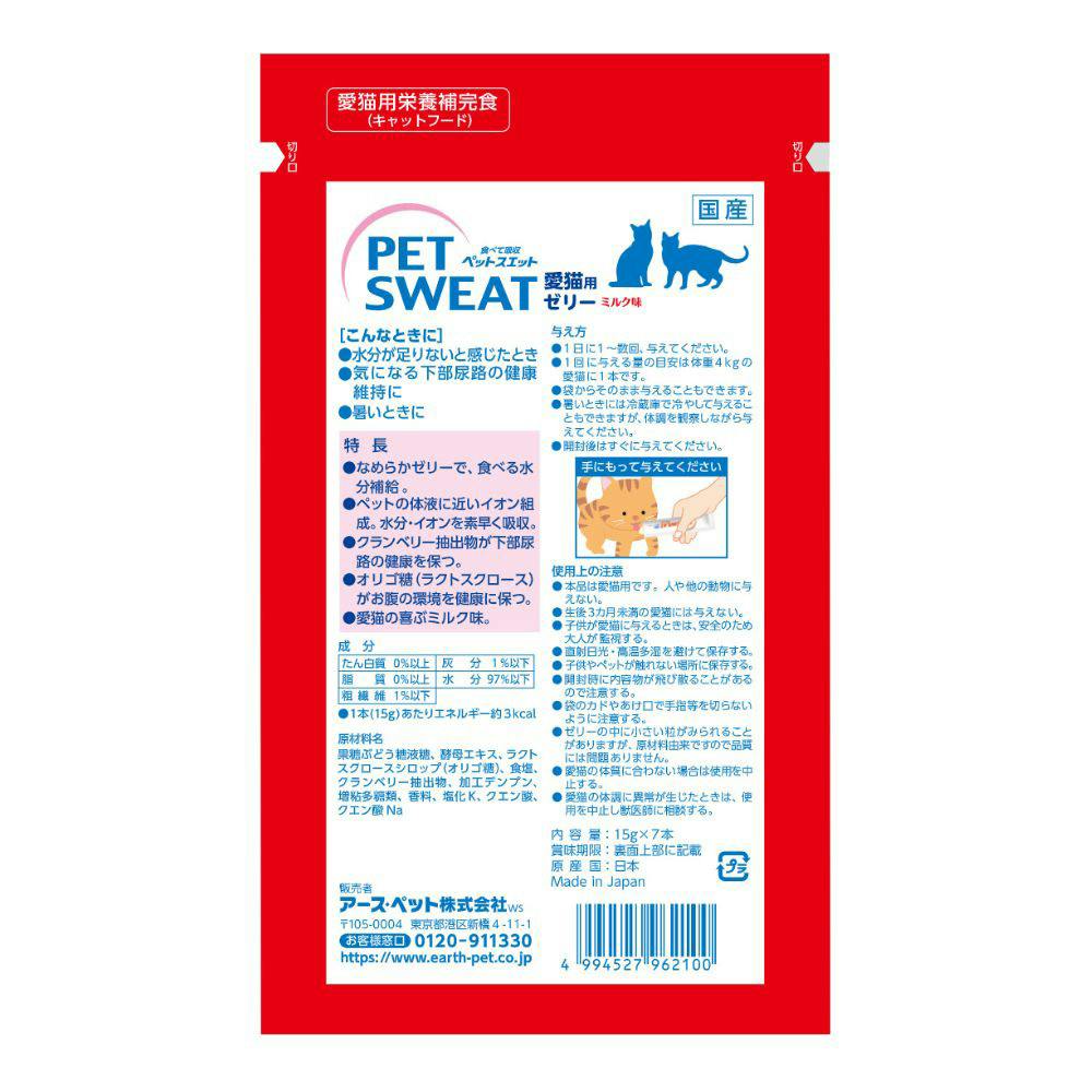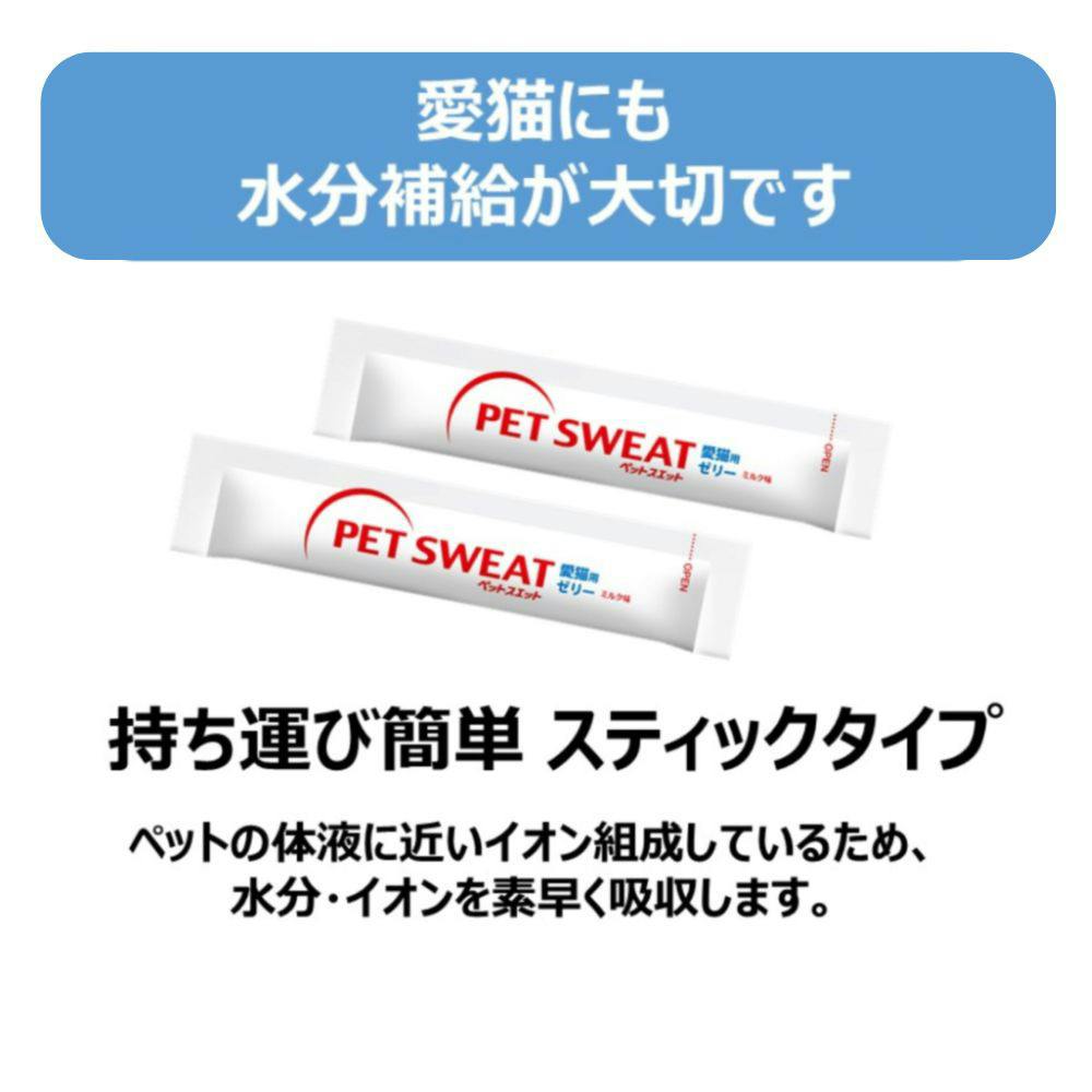 "愛猫の飲料・水分補給に。 食べて吸収 PETSWEAT(ペットスエット)ゼリー ●なめらかゼリーで、食べる水分補給。 ●ペットの体液に近いイオン組成。水分・イオンを素早く吸収。 ●クランベリー抽出物が下部尿路の健康を保つ。