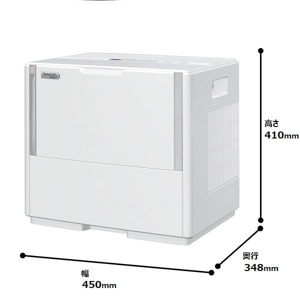 ・サイズ(約):幅450×奥行348×高さ410mm ・質量(約):9.4kg ・タンク容量:約12.0L ・消費電力(50/60Hz):[標準]390/390、[静音]370/370、[eco]42/47 W ・連続加湿時間:[標準]6.7、[静音]10.0、[eco]8.0 時間 ・運転音(最大~最小):[標準]42~15、[静音]28~15、[eco]42~15 dB