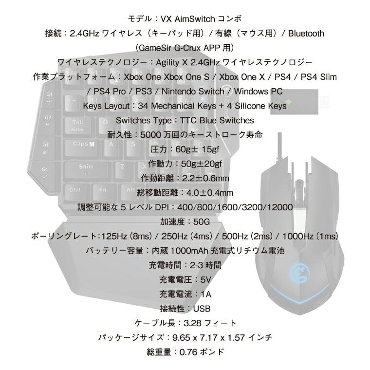 モデル VX AimSwitchコンボ 接続 2.4GHzワイヤレス(キーパッド用)有線(マウス用)Bluetooth(GameSir G-Crux APP向け) ワイヤレステクノロジー Agility X 2.4GHzワイヤレステクノロジー 対応機種 Xbox One / Xbox One S / Xbox One X / PS4 / PS4 Slim / PS4 Pro / PS3 / Nintendo Switch / Windows PC