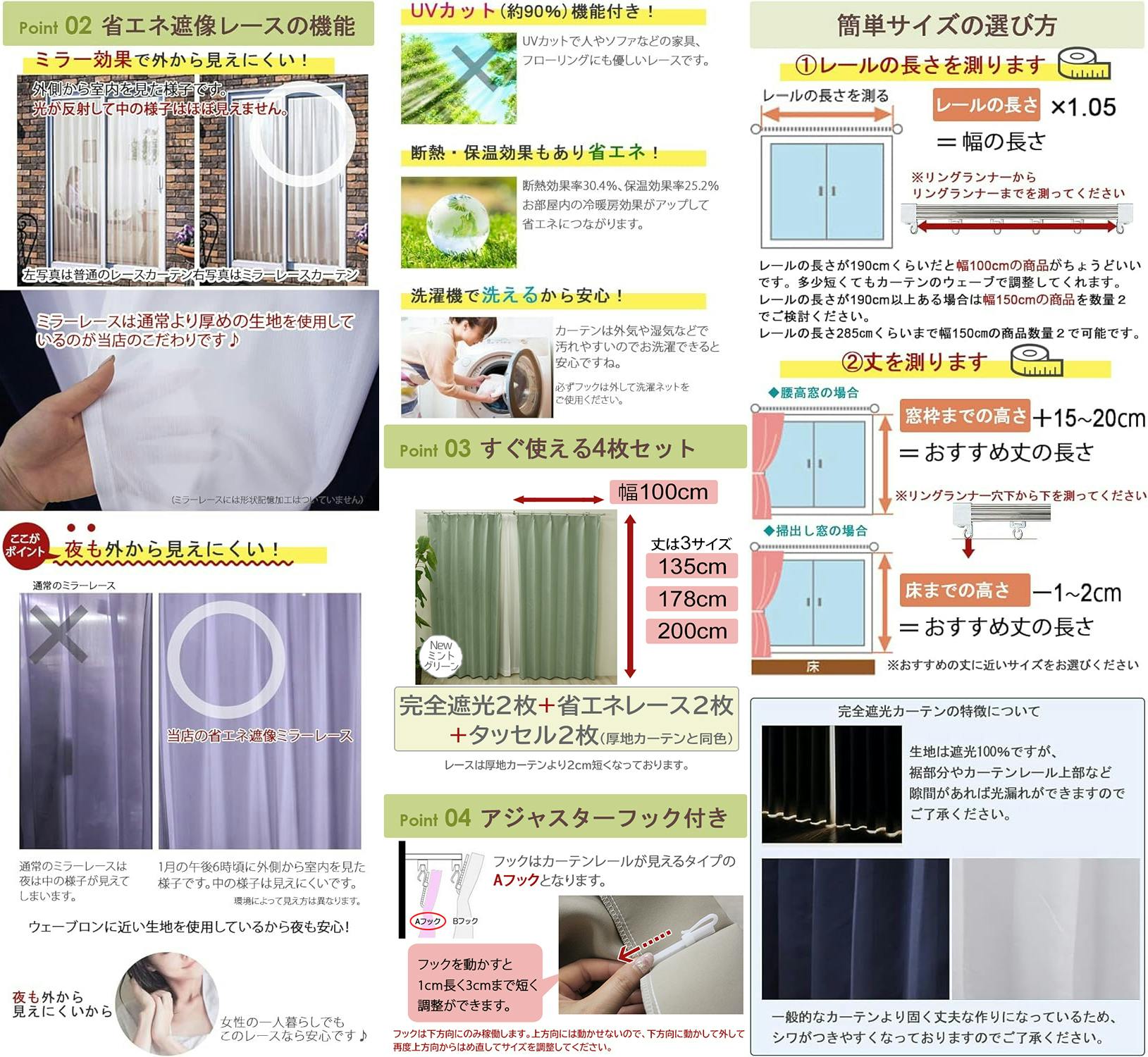 ■厚手カーテン:ウォッシャブル、完全遮光、形状記憶加工、遮音、断熱・保温 ■レースカーテン:ウォッシャブル、UVカット、ミラーレース、防視認性、断熱、保温効果