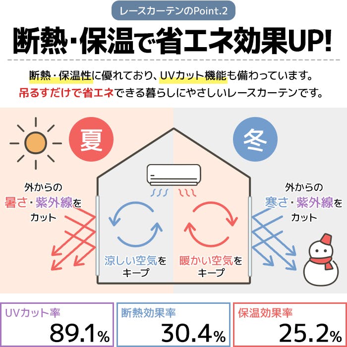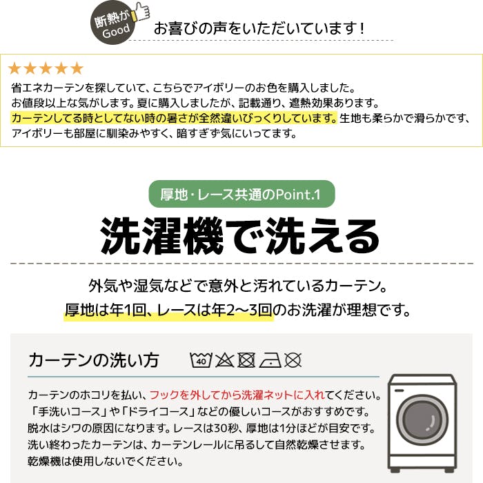 ■厚手カーテン:ウォッシャブル、遮光2級、形状記憶加工■レースカーテン:ウォッシャブル、UVカット、ミラーレース、防視認性、断熱、保温効果
