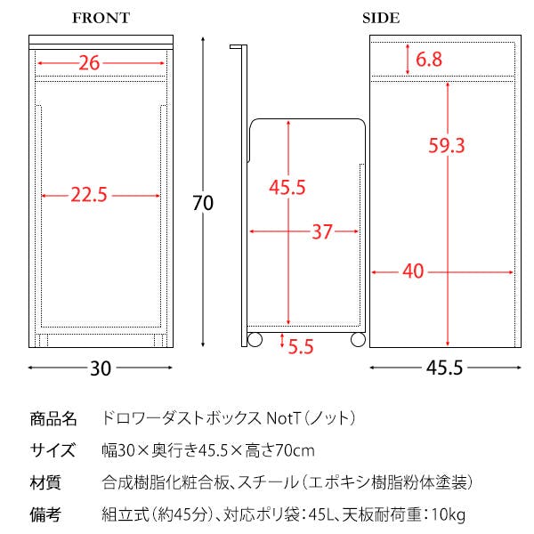 組立式(約45分)、対応ポリ袋:45L、天板耐荷重:10kg