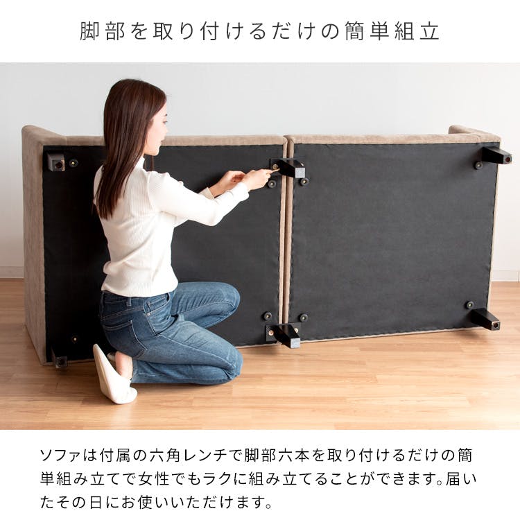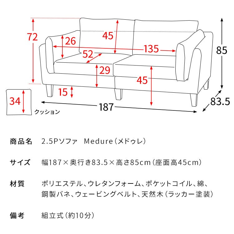 ポリエステル、ウレタンフォーム、ポケットコイル、綿、鋼製バネ、ウェービングベルト、天然木(ラッカー塗装)