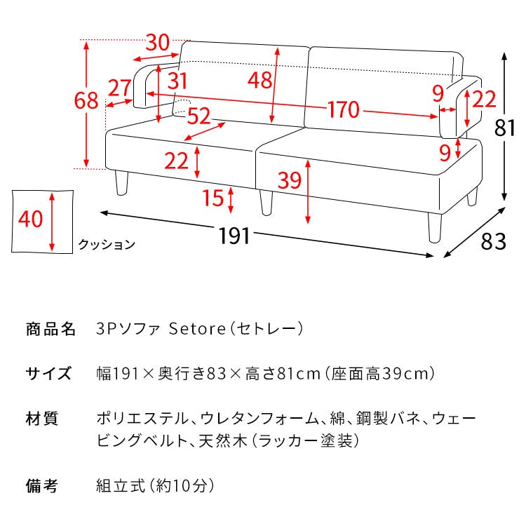 ポリエステル、ウレタンフォーム、綿、鋼製バネ、ウェービングベルト、天然木(ラッカー塗装)