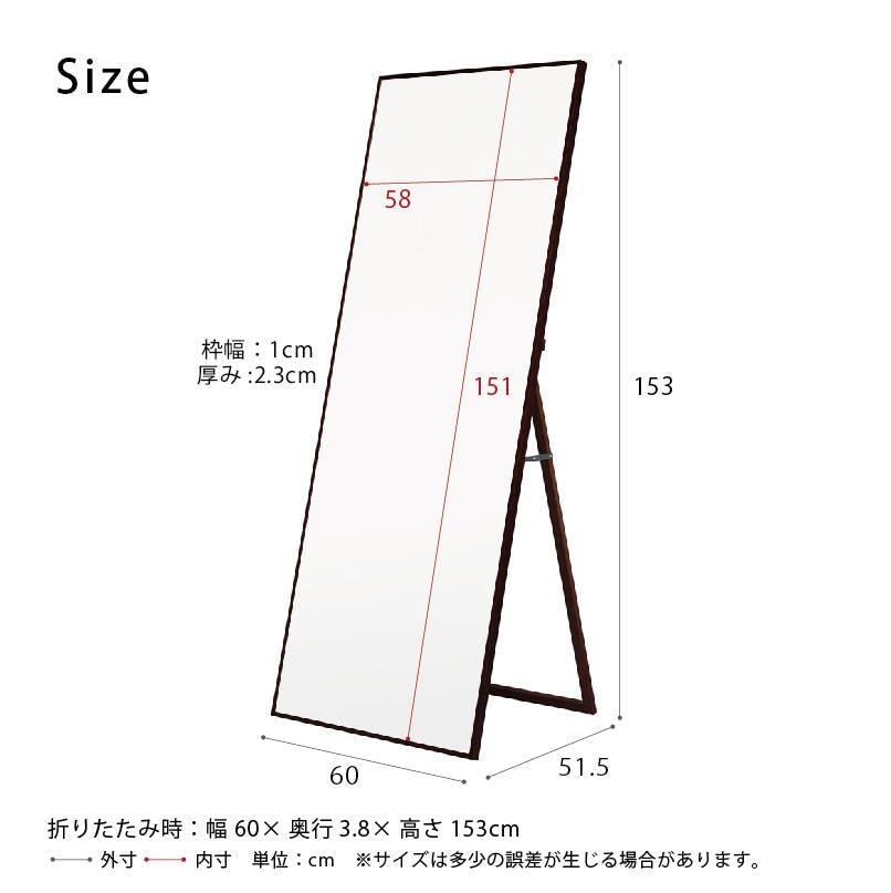 【日本製】【細枠スタンドミラー 幅60cm(ブラウン/茶)】 天然木 姿見 鏡 ワイド 高級感 木製 飛散防止加工 折りたたみ 国産 完成品